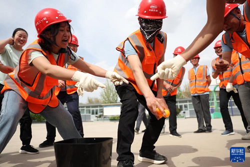 4月29日,中鐵二十局的建設(shè)者參加蒙眼“攪拌”比賽。(新華社記者 陳斌 攝)