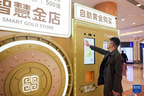 5月5日,在上海市普陀區(qū)一家商場內(nèi)的“智慧金店”,工作人員為市民介紹自助黃金購買設(shè)備上的黃金商品。(新華社記者 王翔 攝)