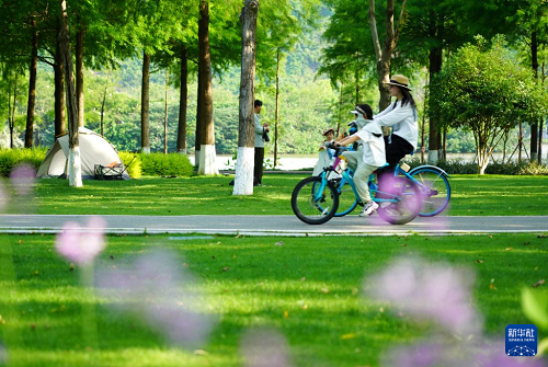 5月10日,人們在浙江省樂清市清和公園林下騎車。(新華社發(fā) 蔡寬元 攝)