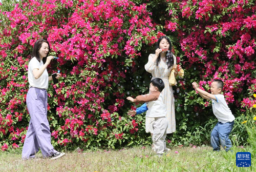 5月10日,在四川樂山三角梅花廊,家長帶著孩子玩耍。(新華社發(fā) 李華時 攝)