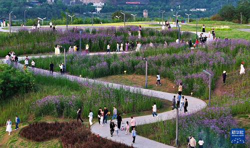5月10日,人們在四川省瀘州市江陽區(qū)茜草街道濱江生態(tài)公園游玩(無人機照片)。(新華社發(fā) 劉學懿 攝)