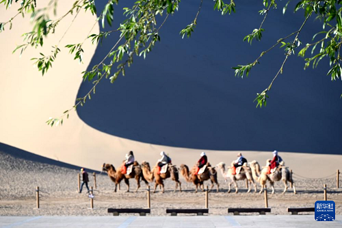 5月10日,游客在甘肅省敦煌市鳴沙山月牙泉景區(qū)游覽。(新華社發(fā) 張曉亮 攝)