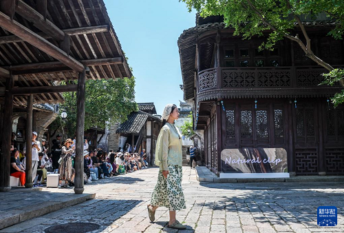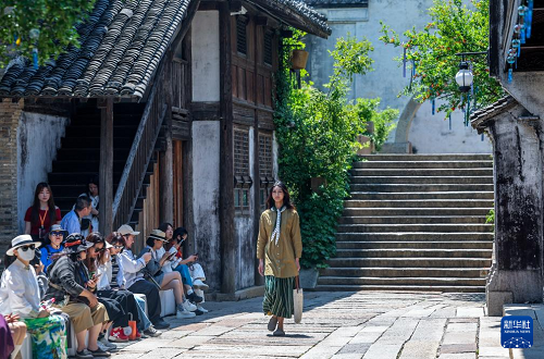 5月12日拍攝的濮院時(shí)尚古鎮(zhèn)老街上舉行的時(shí)裝周“自然剪輯時(shí)裝秀”。(新華社記者 徐昱 攝)