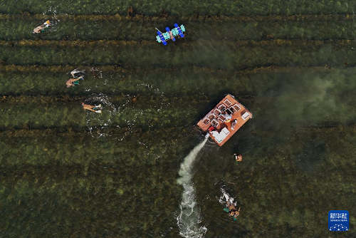 5月12日,河北省昌黎縣茹荷鎮(zhèn)一家海參養(yǎng)殖合作社的工人在捕撈海參(無人機照片)。(新華社記者 楊世堯 攝)