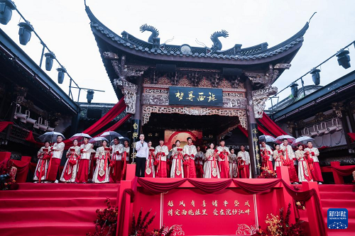 5月20日,新人們在諸暨市西施故里景區(qū)內(nèi)參加集體婚禮的拜天地儀式。(新華社記者 徐昱 攝)