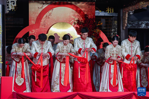 5月20日,新人們在諸暨市西施故里景區(qū)內(nèi)參加集體婚禮的合巹禮儀式。(新華社記者 徐昱 攝)