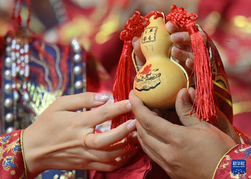 5月21日,一對新人在集體婚禮上進行結(jié)發(fā)禮環(huán)節(jié)。(新華社記者 趙子碩 攝)