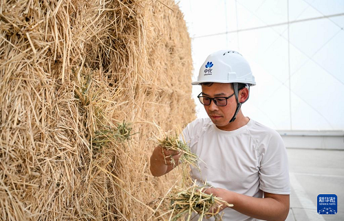 5月22日,技術(shù)人員在赤峰市阿魯科爾沁旗的現(xiàn)代化牧草儲備庫中查看牧草品質(zhì)。(新華社記者 彭源 攝)