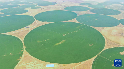 這是5月22日拍攝的赤峰市阿魯科爾沁旗境內(nèi)的優(yōu)質(zhì)牧草種植基地(無人機照片)。(新華社記者 彭源 攝)
