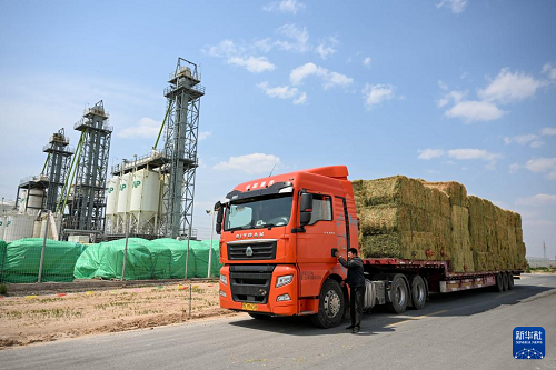 5月22日,在赤峰市阿魯科爾沁旗,一輛滿載牧草的貨車準(zhǔn)備啟程運輸。(新華社記者 彭源 攝)