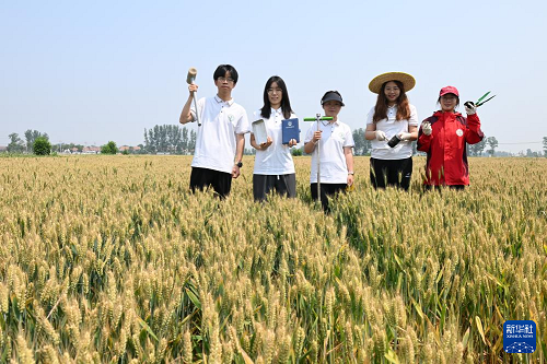 河北省曲周縣傅莊科技小院的學(xué)生在麥田里(5月26日攝)。(新華社記者 牟宇 攝)