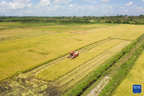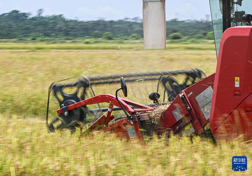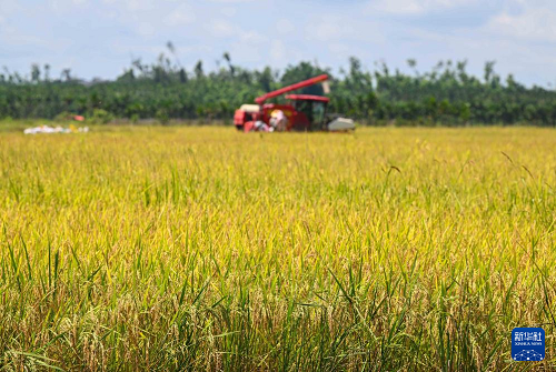 6月7日,收割機在海口市瓊山區(qū)紅旗鎮(zhèn)墨橋村收割“瓊山福稻”。(新華社記者 蒲曉旭 攝)