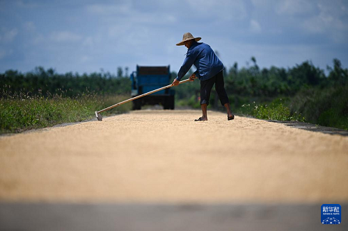 6月7日,農民在??谑协偵絽^(qū)紅旗鎮(zhèn)墨橋村晾曬“瓊山福稻”。(新華社記者 蒲曉旭 攝)