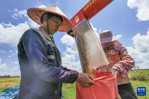 6月7日,農民在??谑协偵絽^(qū)紅旗鎮(zhèn)墨橋村將收割機收割的“瓊山福稻”裝袋。(新華社記者 蒲曉旭 攝)