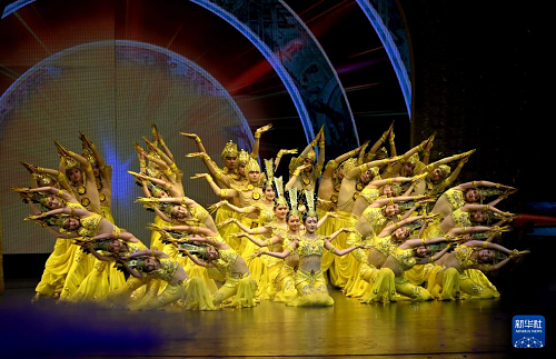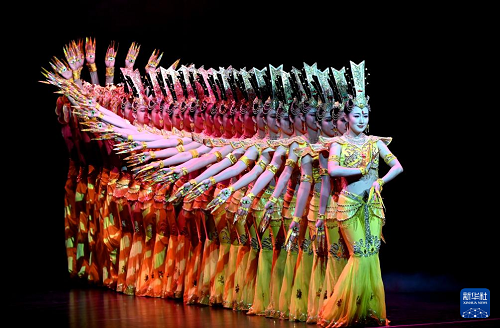 6月8日,中國殘疾人藝術(shù)團演員在甘肅敦煌大劇院表演大型情景音畫劇《千手千眼》。(新華社發(fā) 張曉亮 攝)