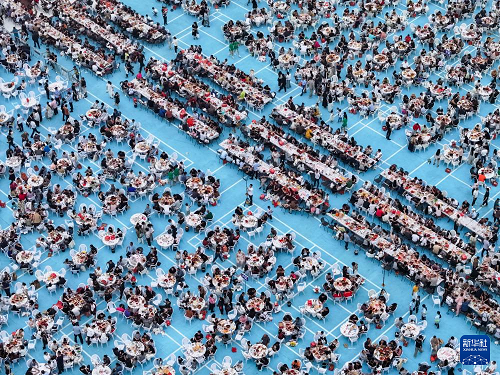 6月12日,人們?cè)邶埼r宴上品嘗小龍蝦(無人機(jī)照片)。(新華社記者 季春鵬 攝)