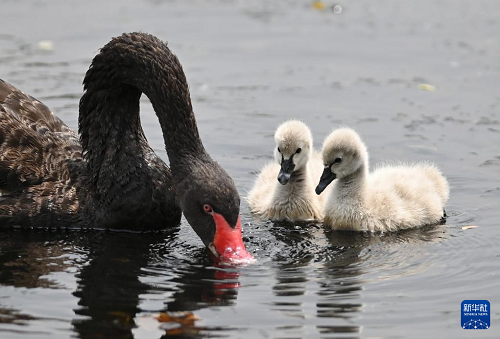6月15日,在山東滕州微山湖紅荷濕地景區(qū),天鵝寶寶隨親鳥(niǎo)在水中覓食。(新華社發(fā) 李志軍 攝)