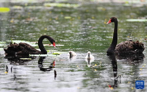 6月15日,在山東滕州微山湖紅荷濕地景區(qū),天鵝寶寶隨親鳥(niǎo)在水中玩耍。(新華社發(fā) 李志軍 攝)