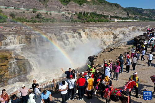 近日,受上游降雨影響,位于山西吉縣和陜西宜川縣交界的黃河壺口瀑布水量大增,壯美奔騰景象吸引眾多游客前來游玩。