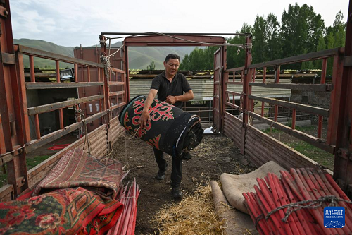 轉(zhuǎn)場(chǎng)第一天,在新源縣那拉提鎮(zhèn)塔依阿蘇村,巴拉提江在家中小院內(nèi)把毛毯搬上貨車(chē)(6月10日攝)。(新華社記者 胡虎虎 攝)