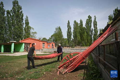 ?轉(zhuǎn)場(chǎng)第一天,在新源縣那拉提鎮(zhèn)塔依阿蘇村,巴拉提江(左)和鄰居一起抬著氈房結(jié)構(gòu)部件走在家中小院內(nèi)(6月10日攝)。(新華社記者 胡虎虎 攝)