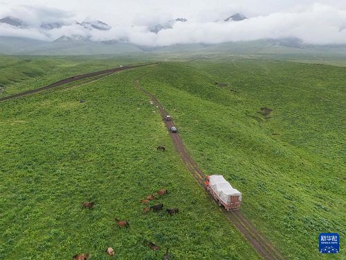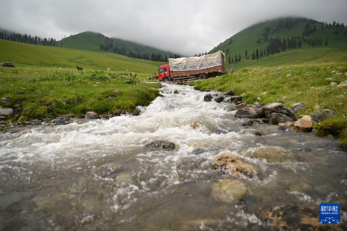 轉(zhuǎn)場(chǎng)第二天,載著氈房等生活物資的貨車(chē)駛過(guò)一處涉水路段(6月11日攝)。(新華社記者 胡虎虎 攝)