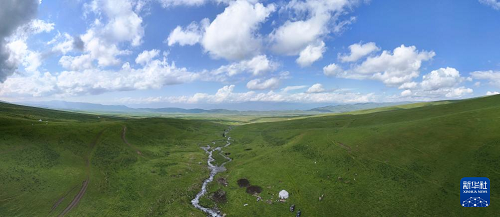 這是6月11日在新疆新源縣那拉提草原拍攝的巴拉提江家的夏牧場(chǎng)和氈房(無(wú)人機(jī)照片)。(新華社記者 胡虎虎 攝)