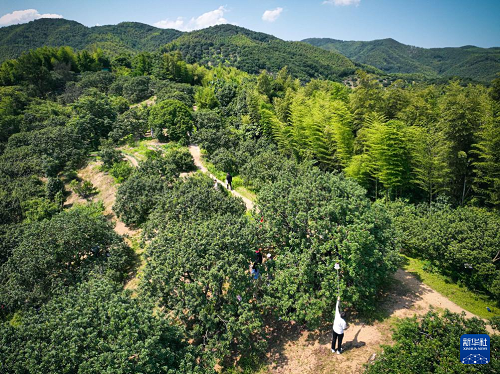6月17日,游客在寧波市江北區(qū)慈城鎮(zhèn)南聯(lián)村體驗(yàn)采摘楊梅(無人機(jī)照片)。(新華社記者 江漢 攝)