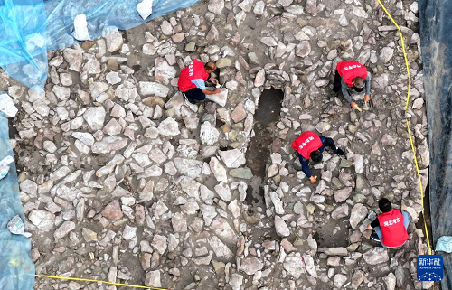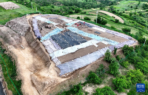 6月18日,宣化鄭家溝遺址考古發(fā)掘項(xiàng)目隊(duì)員在一號(hào)積石冢工作(無(wú)人機(jī)照片)。(新華社記者 王曉 攝)