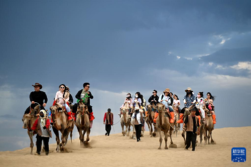 6月21日,游客在甘肅省敦煌市鳴沙山月牙泉景區(qū)騎駱駝游覽。新華社發(fā)( 張曉亮 攝)