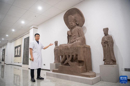 6月24日,在大足石刻文物醫(yī)院,工作人員對石質(zhì)文物進行修復(fù)并采集數(shù)字化信息。(新華社記者 唐奕 攝)