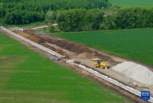 6月23日,北大荒集團(tuán)北安分公司二龍山農(nóng)場(chǎng)有限公司對(duì)排水溝進(jìn)行護(hù)砌施工,構(gòu)建柔性防護(hù)結(jié)構(gòu)穩(wěn)定邊坡,減少水土流失,保護(hù)黑土地(無(wú)人機(jī)照片)。(新華社發(fā) 錢泊羽 攝)