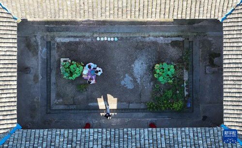 7月3日,游客在五泄鎮(zhèn)古民居內(nèi)體驗(yàn)漆扇制作(無人機(jī)照片)。(新華社記者 翁忻旸 攝)