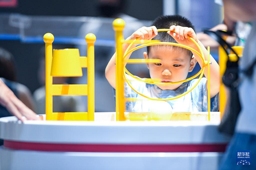 7月8日,小朋友在河北省科學(xué)技術(shù)館體驗(yàn)科普設(shè)備。(新華社發(fā) 張曉峰 攝)