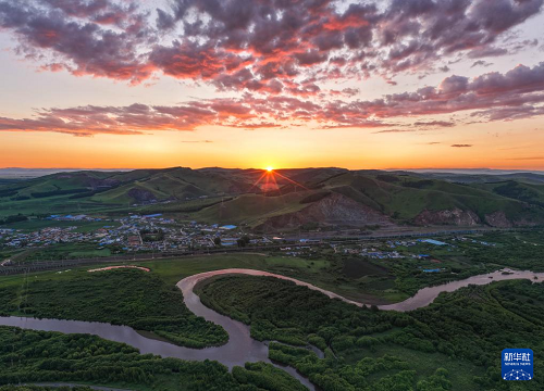 這是7月11日在內(nèi)蒙古免渡河國家濕地公園拍攝的日出景色(無人機照片)。(新華社記者 馬金瑞 攝)