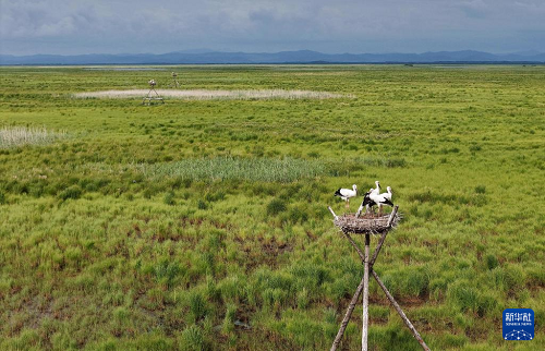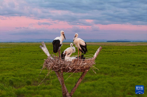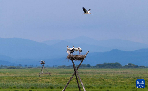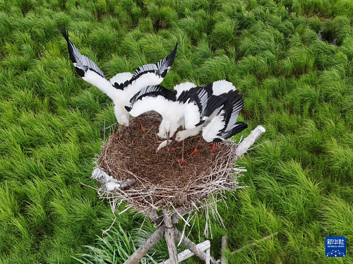 盛夏時節(jié),在位于黑龍江省富錦市的黑龍江三環(huán)泡國家級自然保護(hù)區(qū),人工巢內(nèi)的東方白鸛雛鳥羽翼漸豐,即將離巢。據(jù)保護(hù)區(qū)管理局介紹,保護(hù)區(qū)在落馬湖管護(hù)站搭建的20個人工巢今年全部“入住”東方白鸛,共孵育雛鳥70余只。