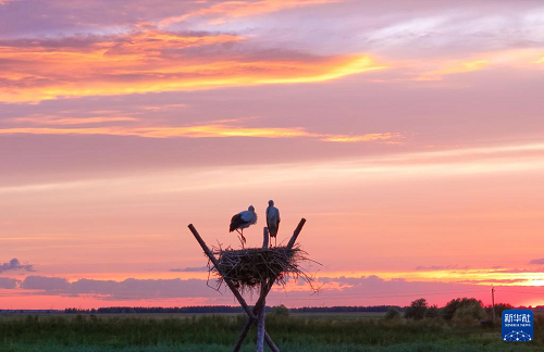 7月13日,在夕陽下的黑龍江三環(huán)泡國家級自然保護(hù)區(qū),東方白鸛在人工巢中活動(無人機照片)。(新華社發(fā) 曲玉寶 攝)