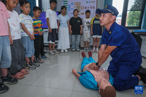 7月15日,在諸暨市安華鎮(zhèn)社會治理中心,消防隊(duì)員為孩子們講解防溺水知識和急救技能。(新華社記者 徐昱 攝)