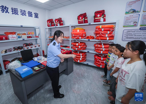 7月15日,在諸暨市安華鎮(zhèn)社會治理中心,安華鎮(zhèn)派出所民警為孩子們講解應(yīng)急救援裝備。(新華社記者 徐昱 攝)