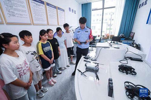 7月15日,在諸暨市安華鎮(zhèn)社會治理中心,安華鎮(zhèn)派出所輔警為孩子們講解無人機(jī)的各項(xiàng)功能。(新華社記者 徐昱 攝)