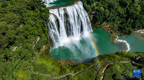7月16日,游客在貴州省安順市黃果樹瀑布景區(qū)游覽(無人機照片)。(新華社記者 陶亮 攝)