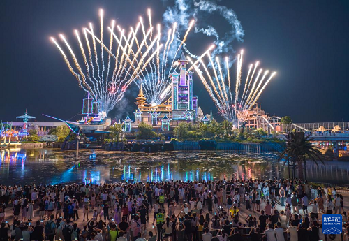 7月19日,在湖北省襄陽市華僑城奇幻谷,游客觀看大型夜間演藝秀《奇幻城堡光影秀》(無人機(jī)照片)。(新華社發(fā) 楊東 攝)