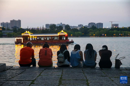7月18日,在山東省濟(jì)南市大明湖景區(qū),市民游客在休閑游玩,觀賞夜景。(新華社發(fā) 郝鑫城 攝)