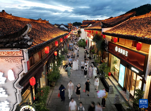 7月20日,在浙江省金華市武義縣,市民和游客在古城游玩(無人機(jī)照片)。(新華社發(fā) 張建成 攝)