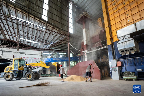 7月24日,在常德市鼎城區(qū)雙橋坪鎮(zhèn)一個水稻烘干工廠,工人把稻谷放入烘干設備。(新華社記者 陳思汗 攝)