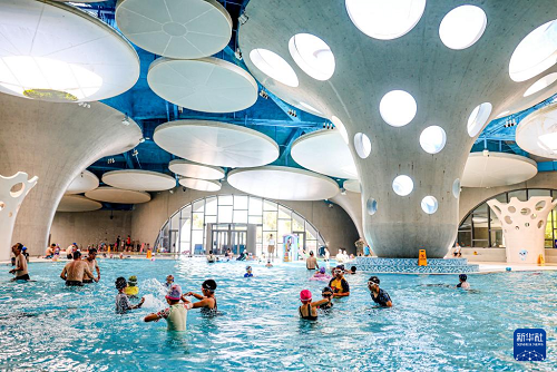 7月27日,在山東省榮成市少年宮游泳館內(nèi),參加暑期游泳技能培訓(xùn)班的孩子們在訓(xùn)練間歇嬉戲。(新華社發(fā) 李信君 攝)