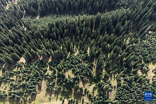 這是8月2日在庫爾德寧拍攝的雪嶺云杉(無人機(jī)照片)。(新華社記者 趙宇思 攝)