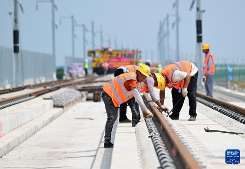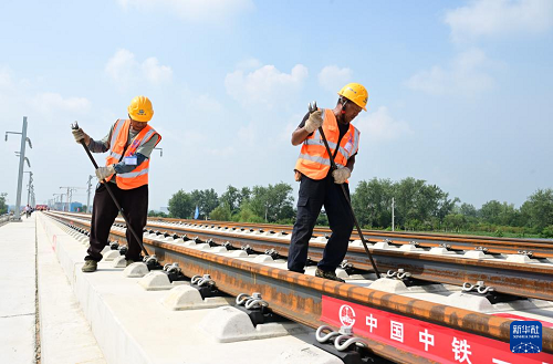 8月6日,中鐵一局施工人員在淮宿蚌城際鐵路鋪軌施工現(xiàn)場(chǎng)作業(yè)。(新華社記者 周牧 攝)