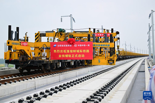 8月6日,在淮宿蚌城際鐵路鋪軌施工現(xiàn)場(chǎng),中鐵一局施工人員將首對(duì)500米長(zhǎng)鋼軌鋪設(shè)在無(wú)砟軌道上,這標(biāo)志著淮宿蚌城際鐵路全線開始鋪軌。