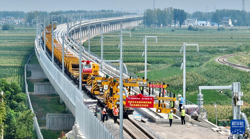 這是8月6日拍攝的淮宿蚌城際鐵路鋪軌施工現(xiàn)場(chǎng)。(新華社記者 周牧 攝)